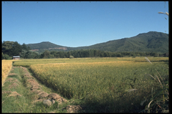 ![]() | スライド−5 その山畑遺跡の発掘現場から峠の方を見たところです。この谷筋を上がっていってずっと...何て言いますか。そろそろ私記憶が無くなってきているんですけれども、地元の方ですとある程度お分かりかと思いますが、後でまたちょっとお話したいと思います。いずれにしましても道路はこの上の棚を上がっていくんですが、川のギリギリではなくて、一段上のところを通っていくんですよね。 |