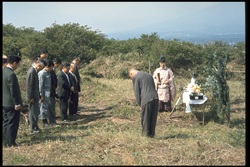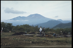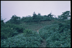 ![]() | スライド−7 これは発掘現場の発掘直前の状態です。手向けが丘だなんて言って、発掘中名づけていました。一応グリットを組んであります。手前の道が万岳荘へ行く道で、越えていくのは、一番左手のところを降りて美濃側へ降りていくというものです。 |