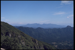 ![]() | スライド−4 これは美濃側に降りてくる道で、あの時既に下から林道がかなり途中まで上がってきていました。あの当時30分降りればこっち側なら近かったんです。楢崎先生はその時、祭祀遺跡の山畑遺跡を調査されていまして、その宿泊は下の温泉と言いますか、良い旅館に泊まっていたものですから一度一泊だけさせてもらったんですけれども、これはまさに天国だ−下が天で上が地なんですけれども−。天地の差があるという風に感じた事がありました。 |