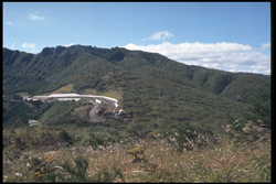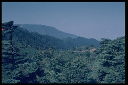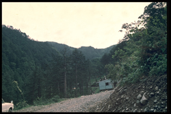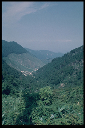 昭和44年の調査 スライド−26 入山峠の方は、これは南軽井沢の方から見たものですが。丁度真ん中のたるんでいるところへ道路が左手の方から上がっていっているのが見えていると思います。軽井沢の方から登っていくところでして。あの一番低い所が峠になっています。 |