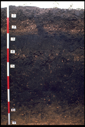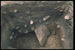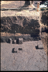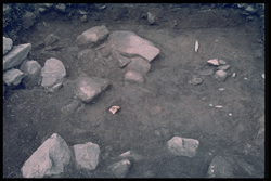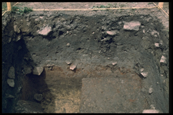 ![]() | スライド−10 これは写真8を比較的深く掘った状態です。土層としてはこれだけ。腐食土層もあるんですけれども、具体的にはここの深いところに遺物は入っていません。この上の方20cm位の分にしか遺物は入ってなくて、あとはもう自然層になってしまっています。 |