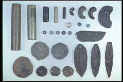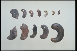 ![]() | スライド−21 これは勾玉類ですね。勾玉類はさっきも出ましたが、割合とちゃんとした作りからペシャンコのものまで一般的にあります。特に上の左から2番目のもの等はナイフか何かで削って作っているんですね。後でちょっとまた言いますが、その場で作っているものだと思います。一番右の下のもの等はこの場で本当に作られたかどうか、少し問題があるかと思います。実はこの神坂峠、石屑と未製品が非常に多く出土しました。という事は現場でかなり作っているという言い方をして良いと思いますけれども。それにしても右下のもの等は正確に玉造の工程をふんだ作りであり、この現場で出来たかどうかちょっと疑問があるものです。 |