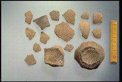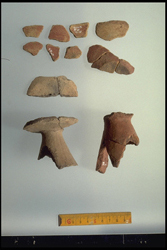 ![]() | スライド−16 須恵器の坏と、それから緑釉の陶器が出ています。灰釉の土器も出ていますし、土師器も出ていますが、基本的にはこういう様な色々な土器が通っている事は事実です。その中でもまつりに関係する土器...どれがまつりに関係する、どれがまつりに関係せず、たまたまそこへ落として割れてしまったから捨てていったとか、そういう事も絶対に無いとは言えないと思います。しかし坏とかあるいはこの緑釉等はやはりまつりに関係しているとみた方が良いのではないかと思います。須恵器の■〈はそう〉の出土は、これは土層が時代とはまるきり違う訳です。それにしても土層を分けて発見できる様な状態ではなかったという事です。 |