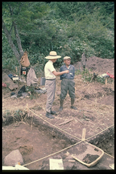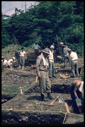 ![]() | スライド−18 大沢和夫先生です。あとはよく分からないですけれども、宮沢先生は分かる人がいますか?奥の日陰に立っているのが楢崎先生だと思うんです。こんな様な状態です。発掘現場はそんなに深くなく、割合と浅い状態なんですけれども。これは南から北を見ています。 |