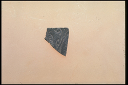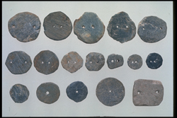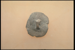 石製模造品の傾向 スライド−20 これは実は調査の不行き届きで、発掘直後に見学にきた森谷さん達が拾ってどなただか詳しくは分からないんですけれども「あったよ」、と言われて持ってこられたものです。だからあげ土の中に入っていたと思うんですけれども。鏡の石製模造品ですが、鈕がついていますが鈕の穴が無いものです。 |