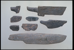 ![]() | スライド−11 遺物は石製模造品で、刀子の柄が無いものとか、それから剣形、あるいは管玉が出ています。この様に地山には石がありますし、それらの石が何か組み合わせられていきそうにも思うんですが、石などを組み合わせた様な状況ではありませんでした。 |