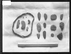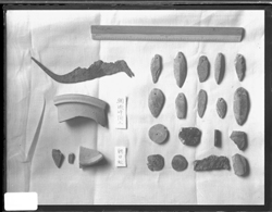 ![]() | スライド−36 大場先生の、昭和26年か、網掛の写真です。これは確か今も遺物があるかと思います、薙鎌。網掛峠から出た薙鎌を含めて、これらの遺物を大場先生が撮影した手札版のガラス乾板の写真です。 |